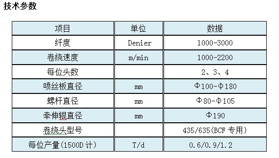 丙綸BCF紡絲機技術(shù)參數(shù)如下: